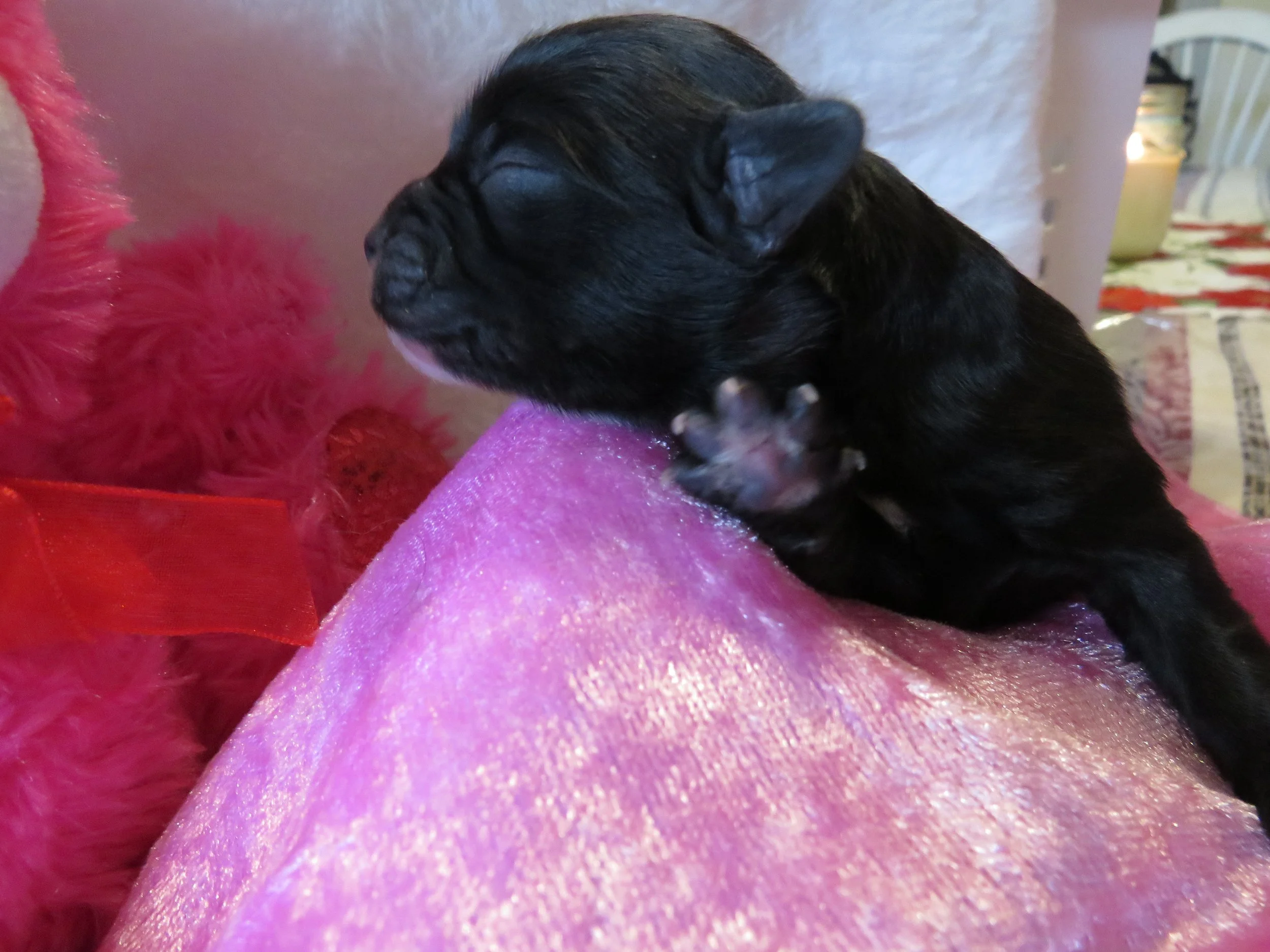 Harley is a darling little princess! She has a smooth coat like her dad, with white accents on her toes, chin, and chest.