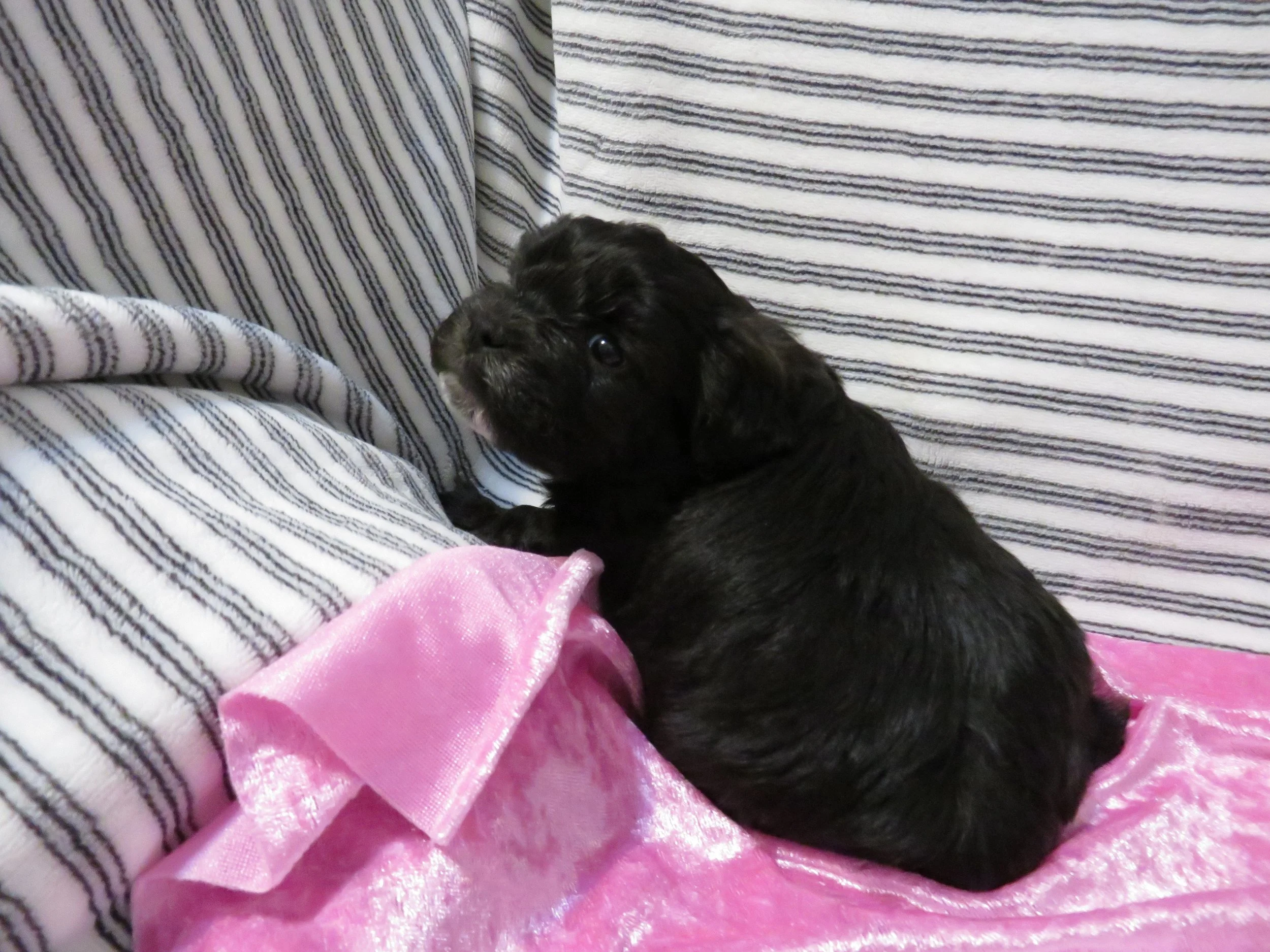 Each of our puppies is given a well check by our local vet before coming home to you, and is up to date on vaccinations & dewormer. Each one comes with his/her vet records, a health guarantee, some puppy food, and a familiar blanket.