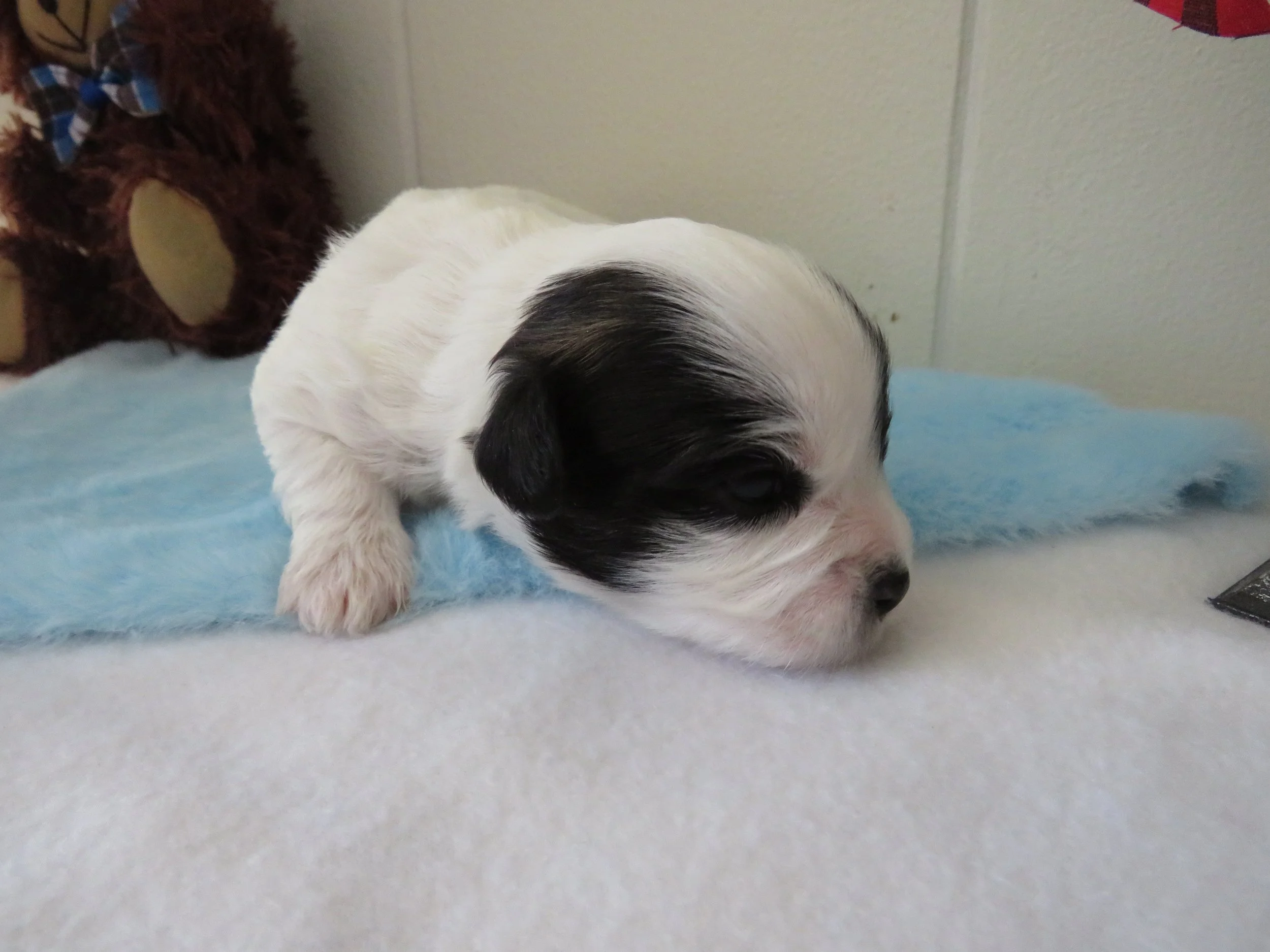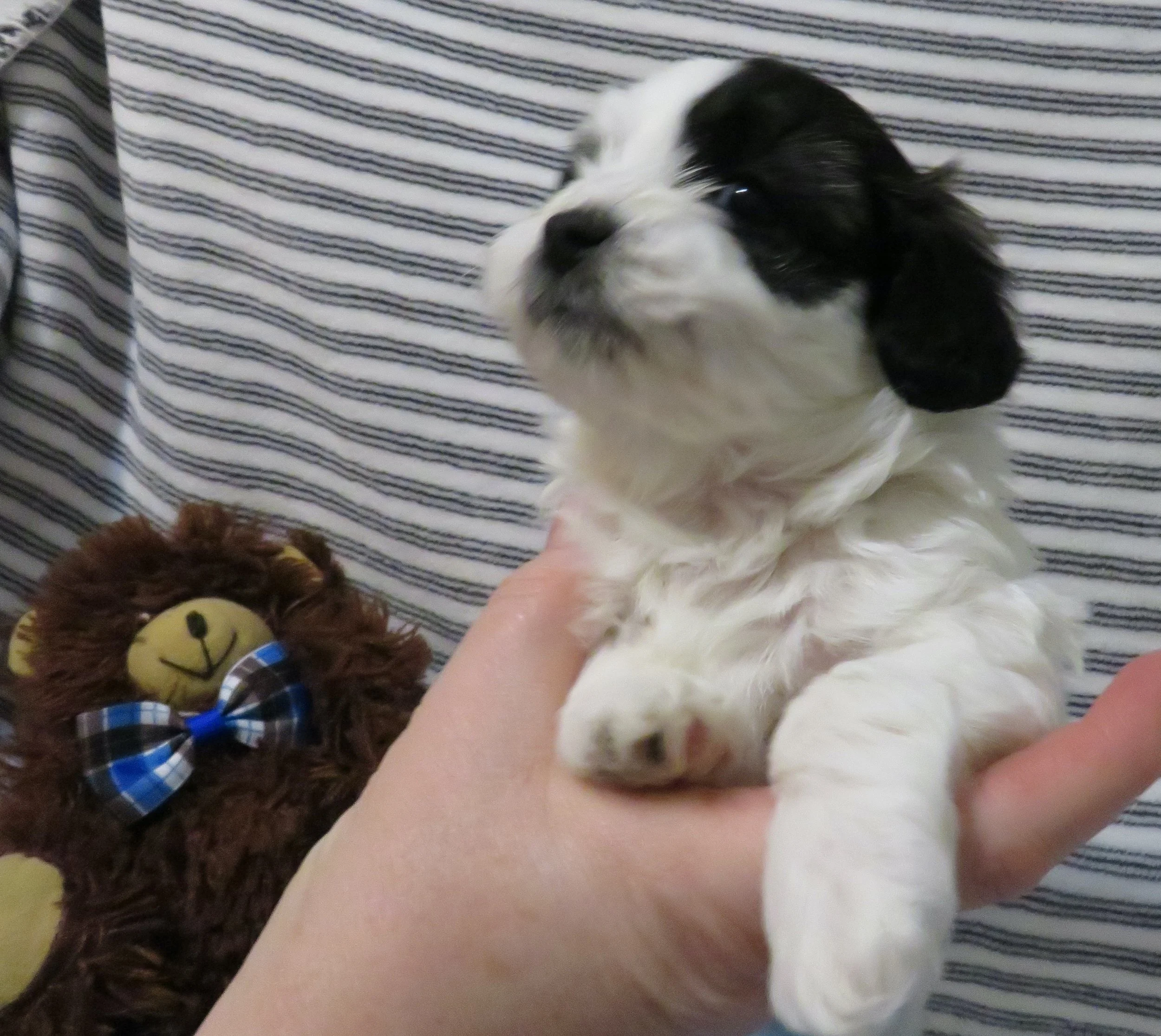 Hudson is a handsome little boy with white curly coat and black spots around his eyes and the base of his tail. The black spots have beautiful brown hairs mixed in the black.