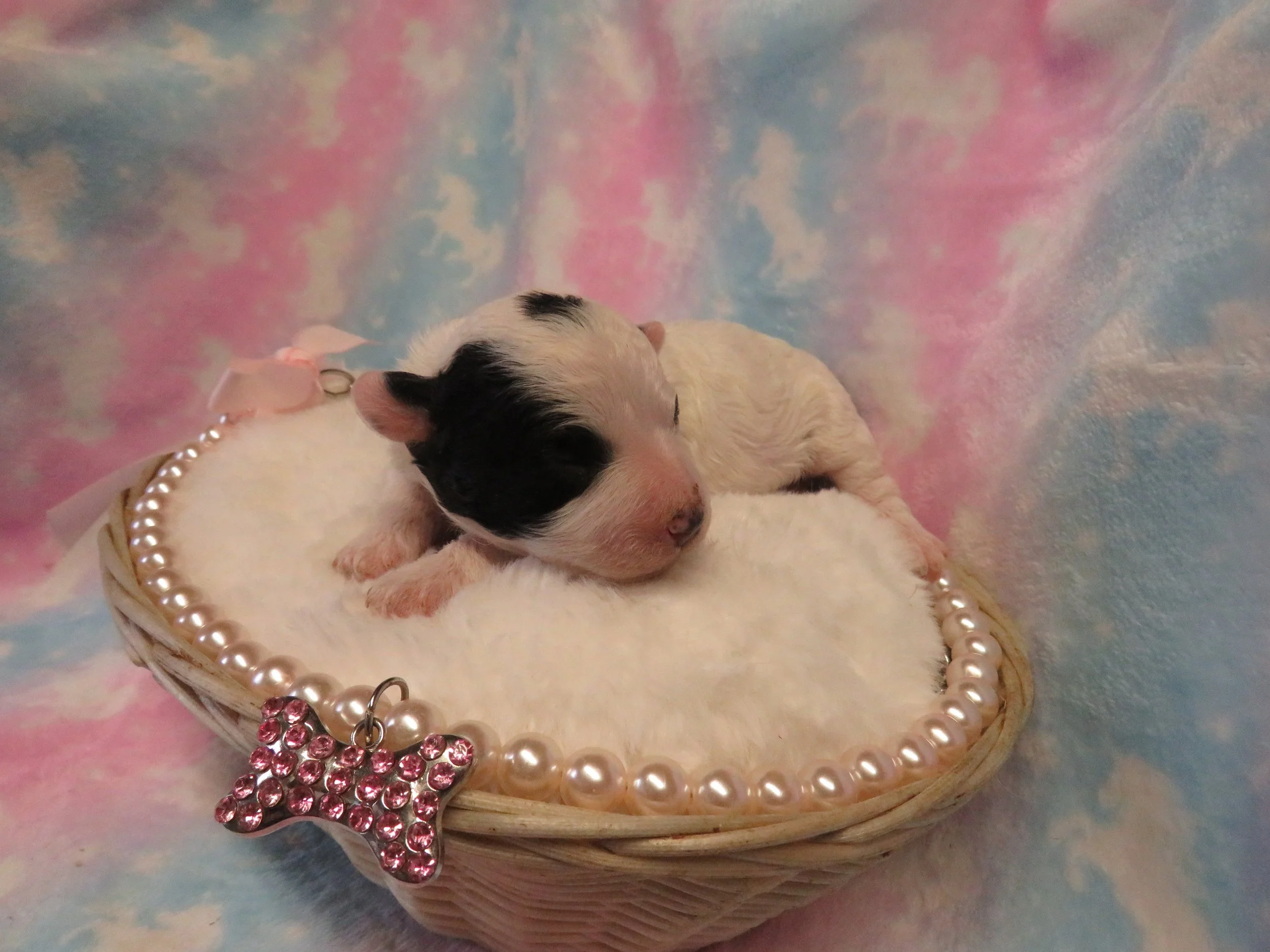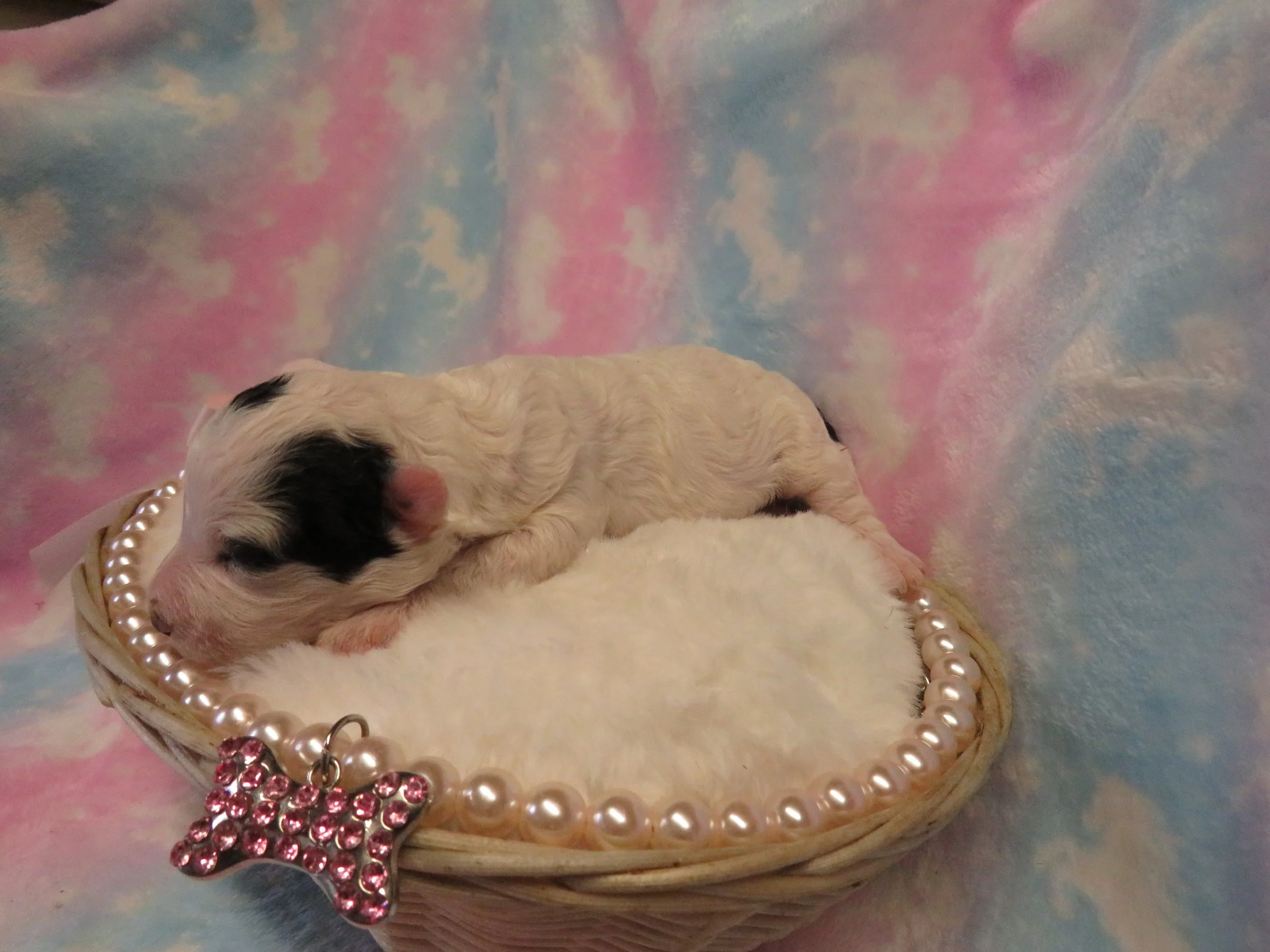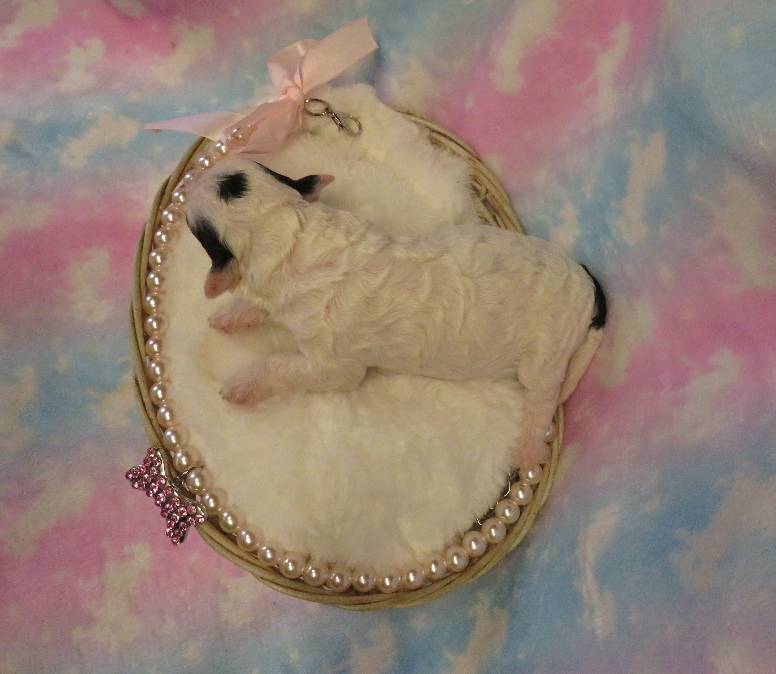 Italia is a beautiful little girl! Her coat is hypoallergenic, a beautiful white color with a few touches of black.